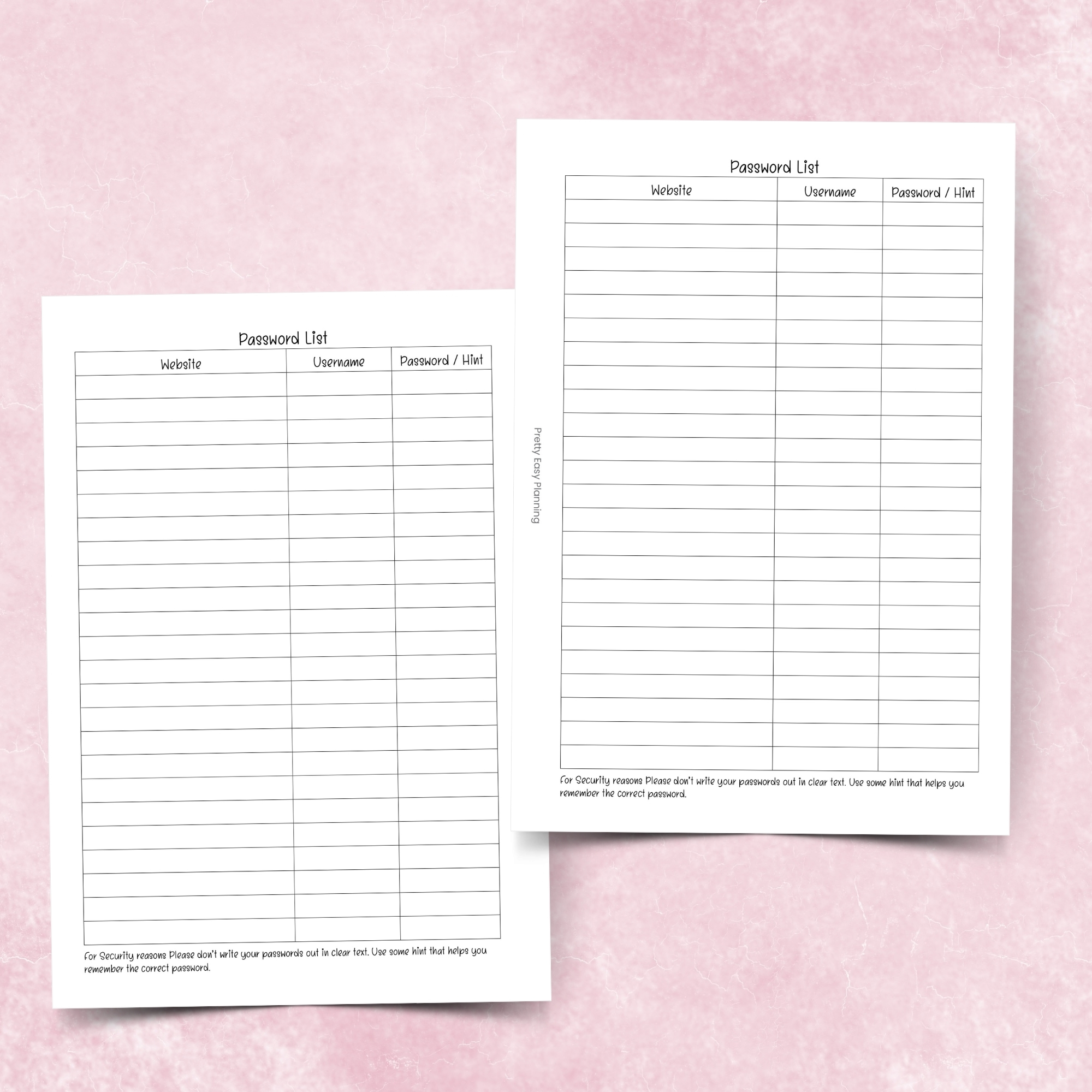 A5 password log insert. Printable PDF for tracking usernames, logins, and notes. Fits Filofax & A5 planners. Instant digital download.